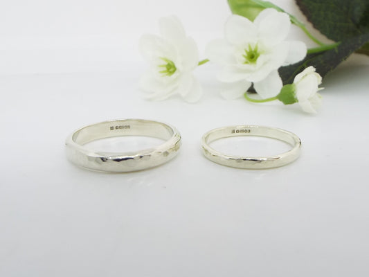 His and Hers 9ct White Gold Wedding Band Set - Hammered finish