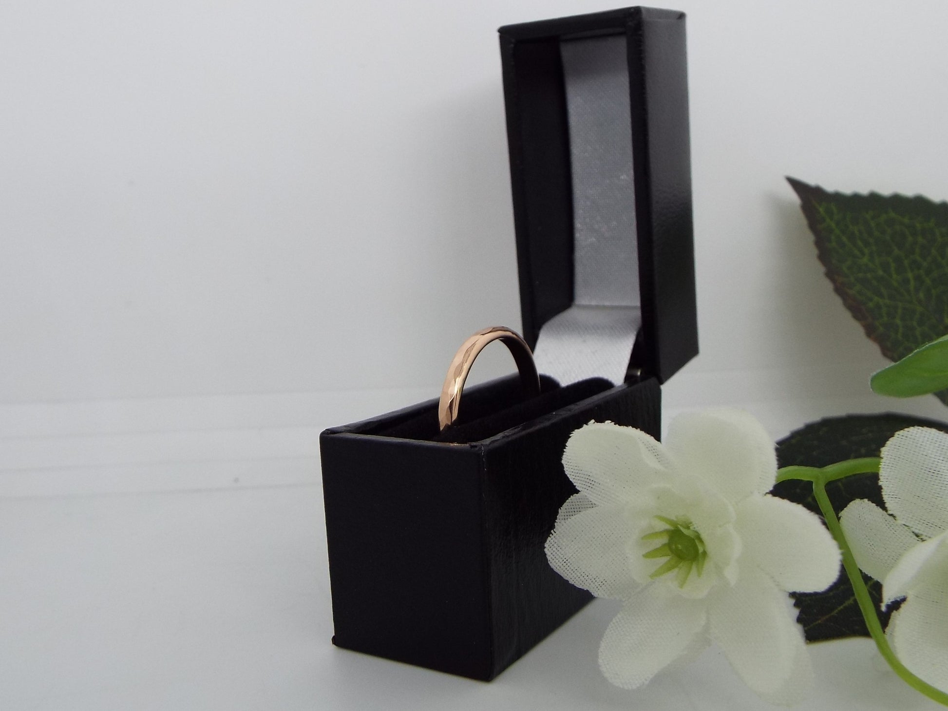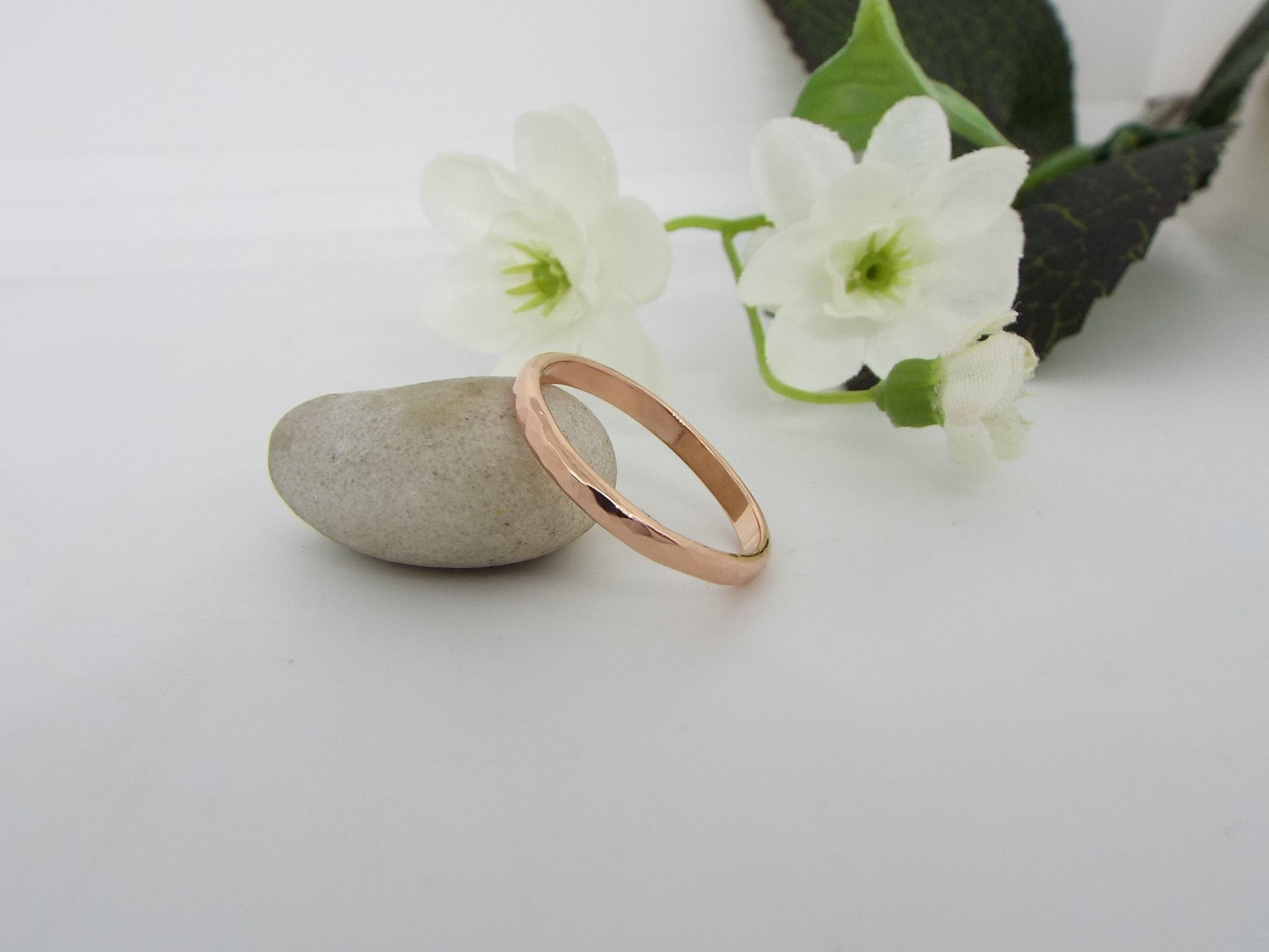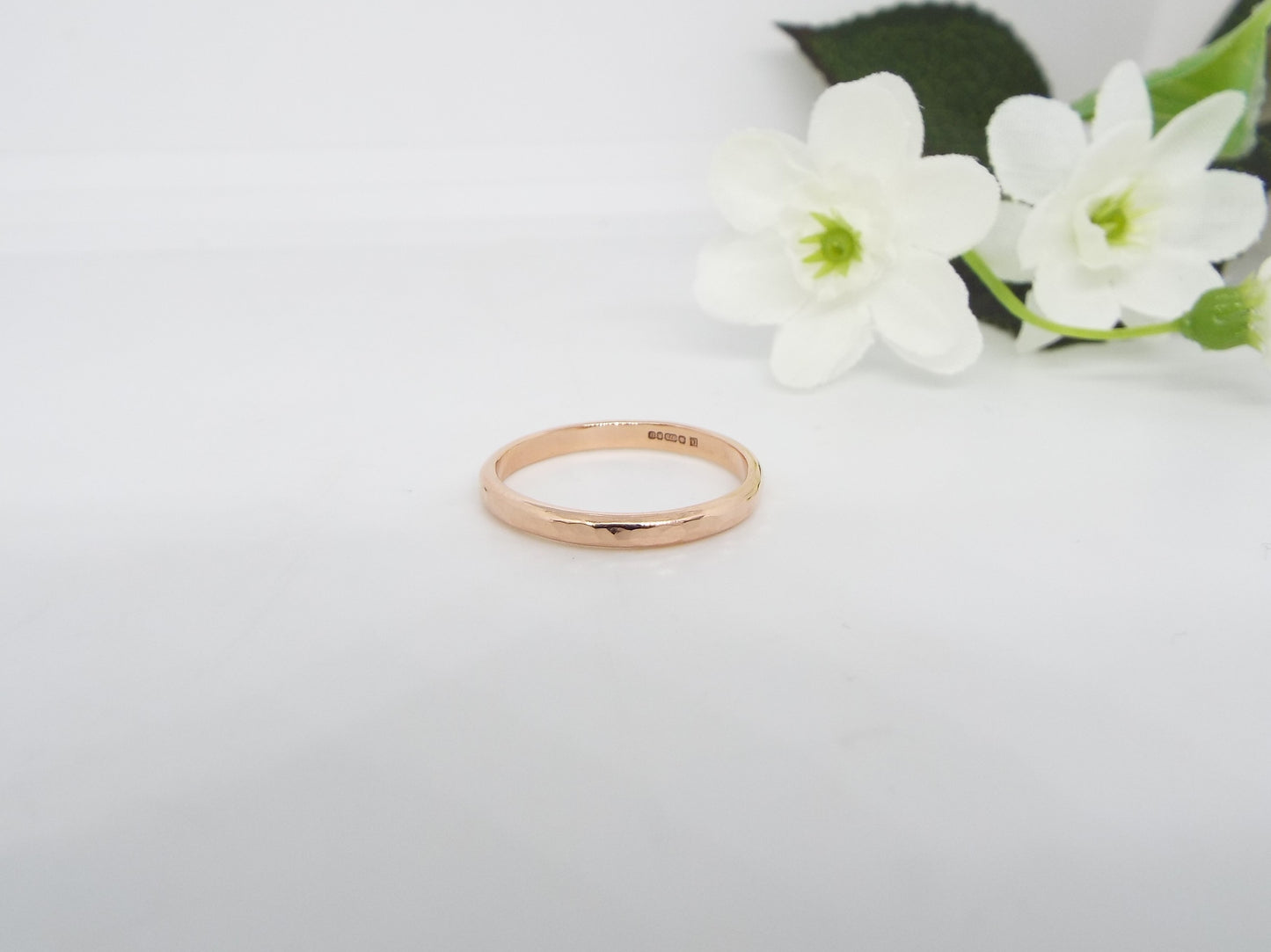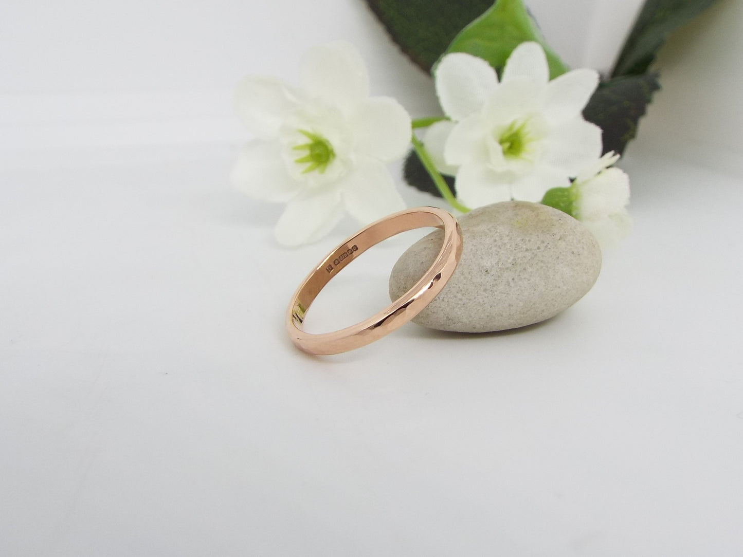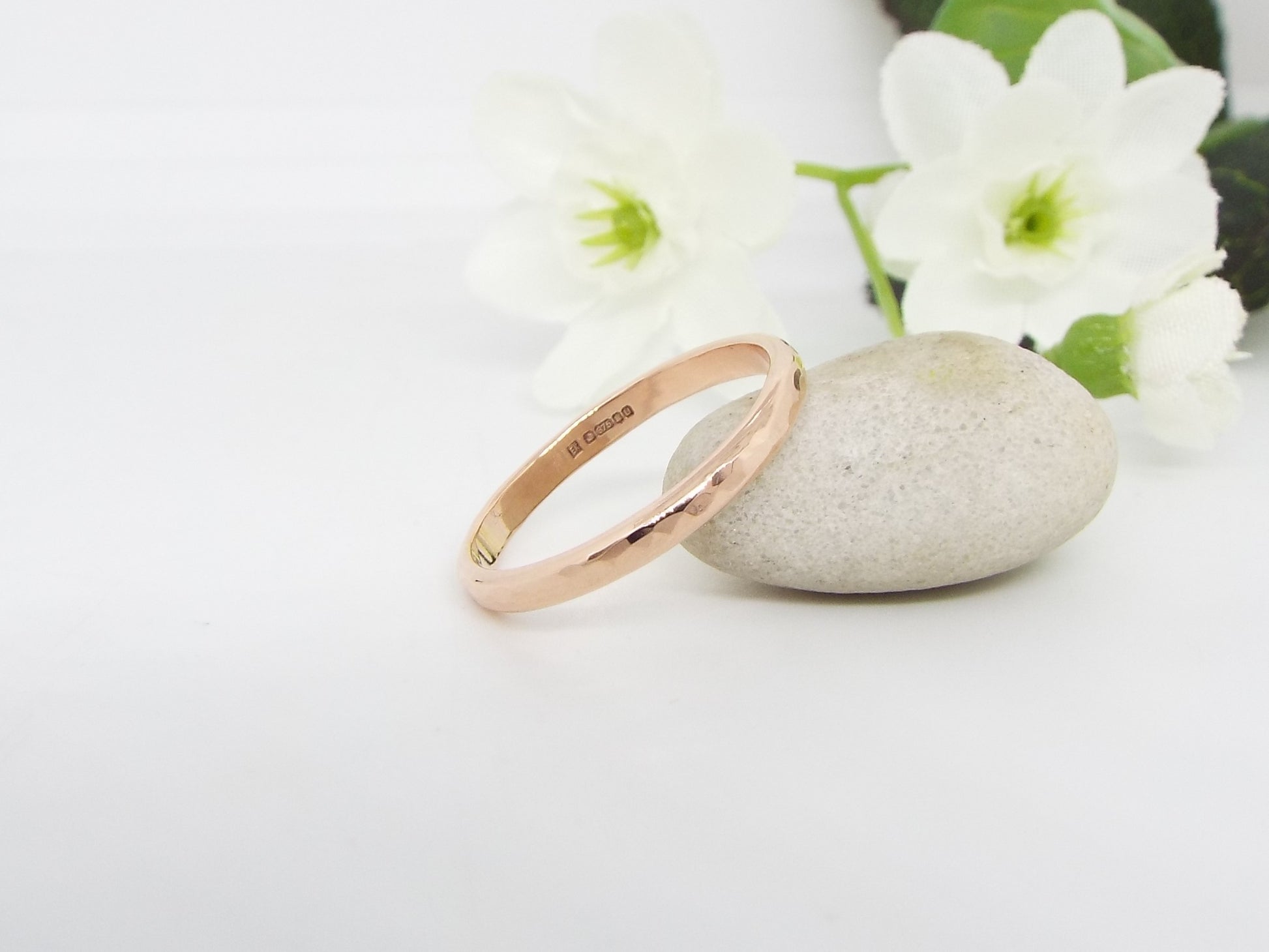 This beautiful rose gold wedding ring has a polished and hammered finish that catches the light beautifully. The slightly rounded band is comfortable for everyday wear. Perfect for a wedding or promise ring. Handmade from solid 9ct rose gold.