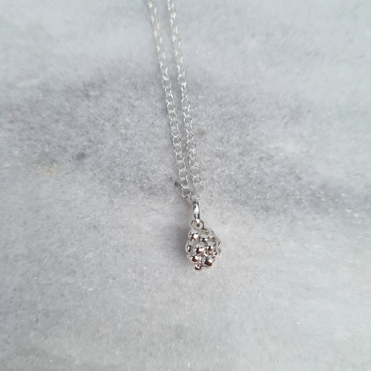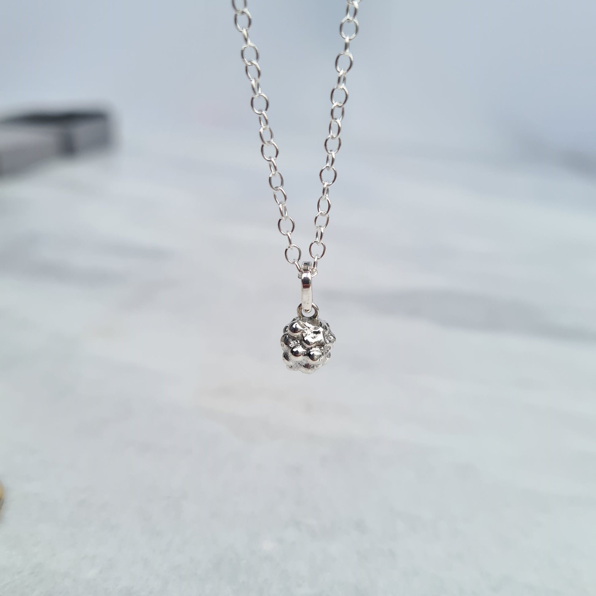 This sweet little bramble berry pendant is hand-cast from recycled sterling silver. Each little bramble hangs on a 45cm sterling silver chain.