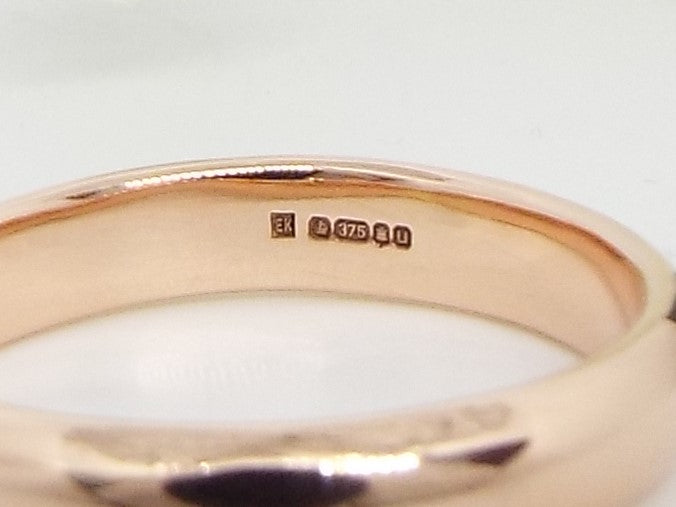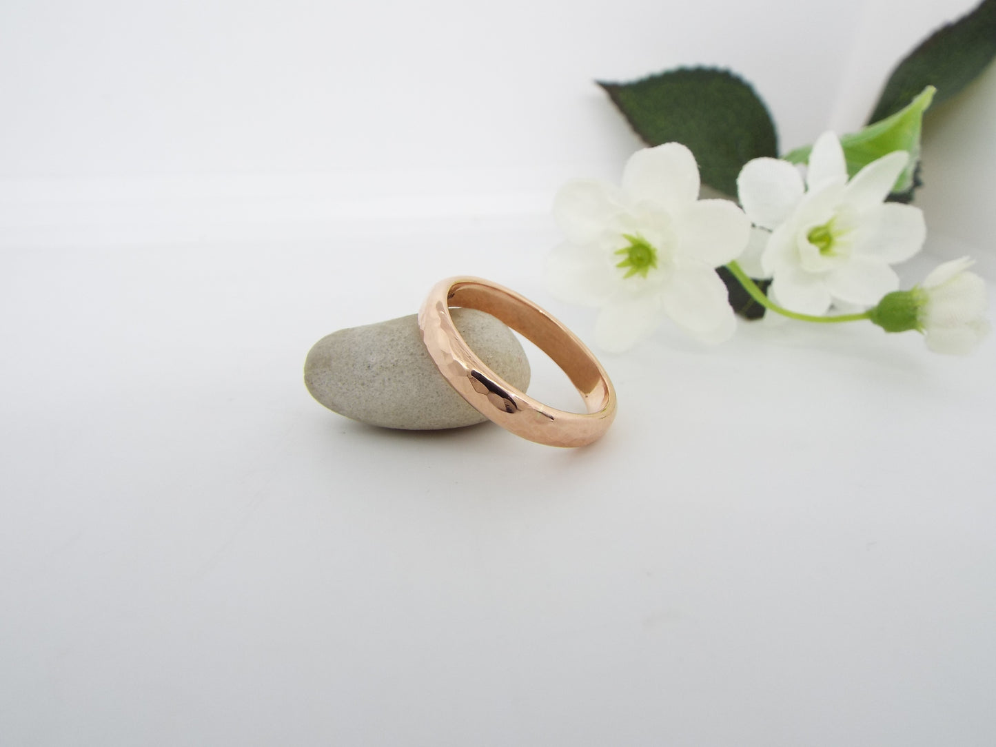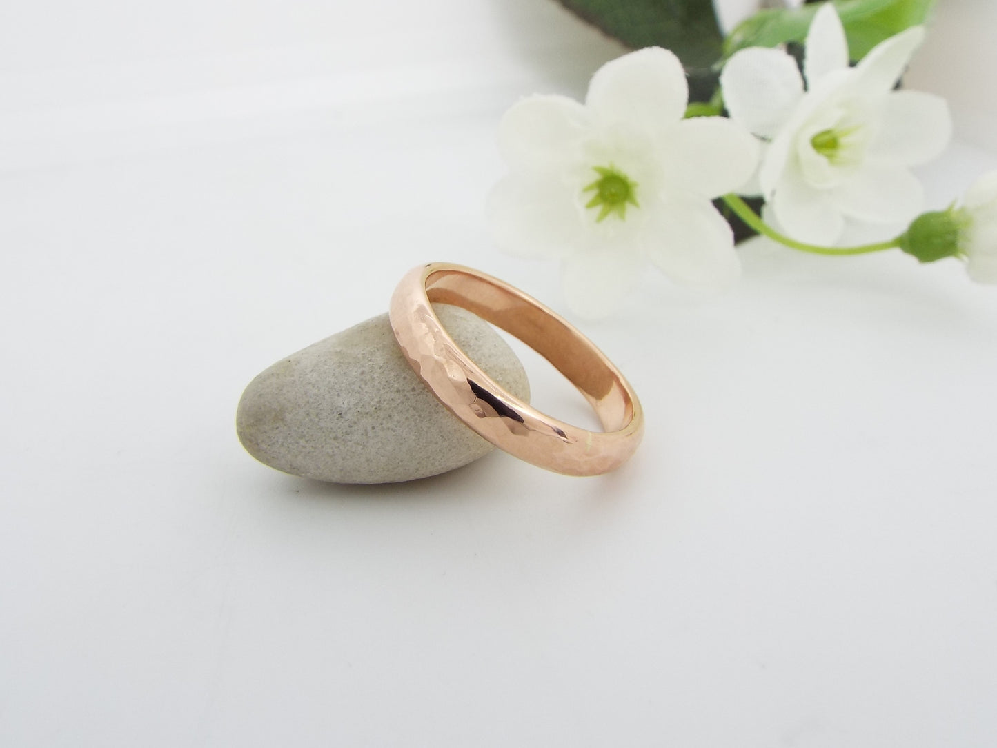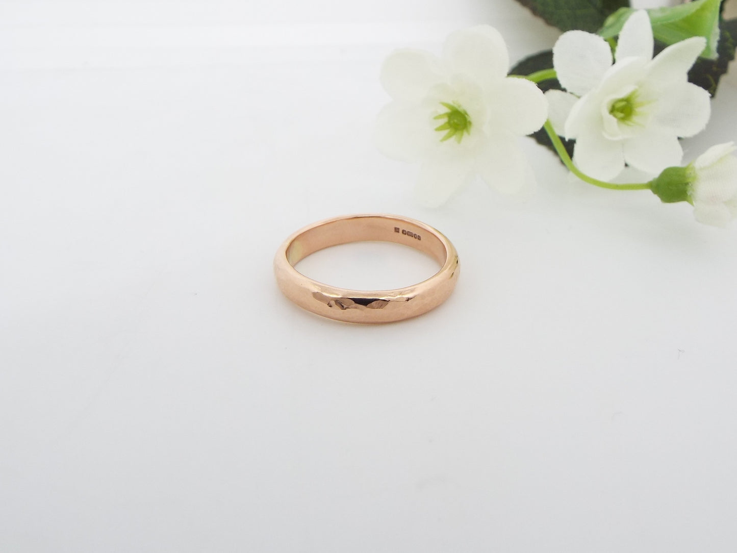 This solid, hammered gold wedding ring has been handmade from 9ct rose gold. The band has a slight d shape making it comfortable for everyday wear.